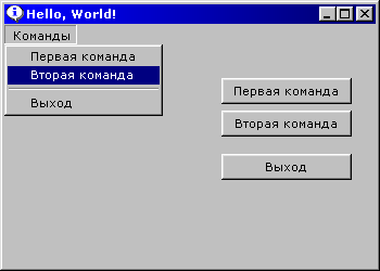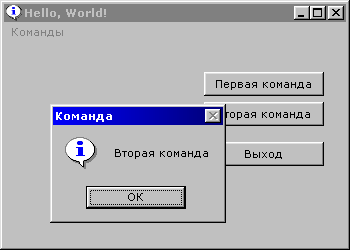 procedure ProcessCommand (Wnd : HWnd; Command : word); begin case Command of CMD_EXIT : PostMessage (Wnd, WM_CLOSE, 0, 0); CMD_FIRST : MessageBox (Wnd, 'Первая команда', 'Команда', MB_ICONASTERISK); CMD_SECOND : MessageBox (Wnd, 'Вторая команда', 'Команда', MB_ICONASTERISK) end; end;