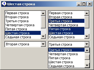 . . . . . const ID_LISTBOX_SINGLE = $101; . . . . . ctl := CreateWindowEx (WS_EX_CLIENTEDGE, 'LISTBOX', '', WS_CHILD or WS_VISIBLE or WS_VSCROLL or LBS_HASSTRINGS or LBS_NOTIFY, 10,10, 135,100, Wnd, ID_LISTBOX_SINGLE, HInstance, nil ); . . . . . SendMessage (ctl, LB_ADDSTRING, 0, longint(pchar('Первая строка'))); SendMessage (ctl, LB_ADDSTRING, 0, longint(pchar('Вторая строка'))); SendMessage (ctl, LB_ADDSTRING, 0, longint(pchar('Третья строка'))); SendMessage (ctl, LB_ADDSTRING, 0, longint(pchar('Четвертая строка'))); SendMessage (ctl, LB_ADDSTRING, 0, longint(pchar('Пятая строка'))); SendMessage (ctl, LB_ADDSTRING, 0, longint(pchar('Шестая строка'))); SendMessage (ctl, LB_ADDSTRING, 0, longint(pchar('Седьмая строка'))); SendMessage (ctl, LB_ADDSTRING, 0, longint(pchar('Восьмая строка'))); SendMessage (ctl, LB_ADDSTRING, 0, longint(pchar('Девятая строка'))); SendMessage (ctl, LB_ADDSTRING, 0, longint(pchar('Десятая строка'))); . . . . .