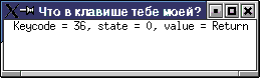 1. Используя функции XKeysymToString() и XKeycodeToKeysym(), напишите программу, которая реагирует на нажатие клавиш в окне выдачей в него кода символа, состояния модификаторов и символьной расшифровки нажатой клавиши.