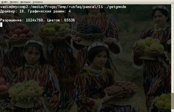 WriteLn('Драйвер: ', Driver, ', Графический режим: ', Mode);