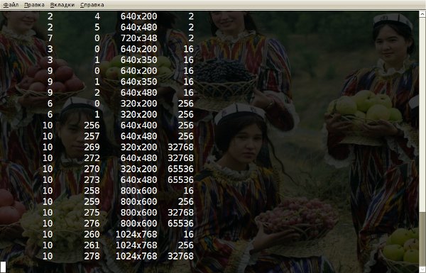 В первом столбце новер драйвера, во втором - номер графического режима, в третьем - разрешение, в четвёртом - количество цветов. Как видите, кроме старых номеров графического режима, которые были ещё в TurboPascal и которые имеют номер меньше 10, есть ещё группа режимов, номер у которых больше 100 и которые, судя по разрешению и цветности, более подходят для современных программ. Это так называемые VESA-режимы.