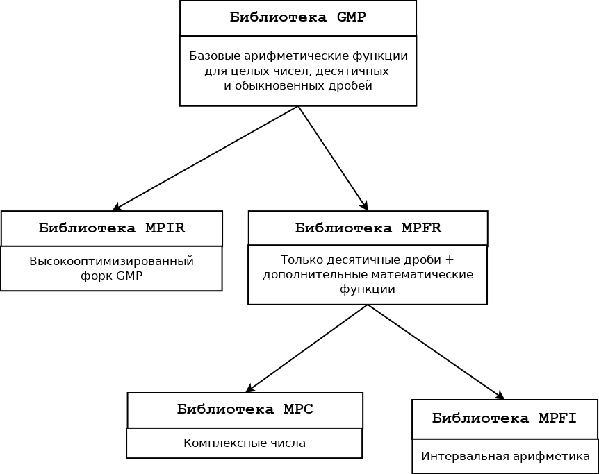 Длинные числа начинаются с библиотеки GMP, в которой реализованы базовые типы длинных чисел и базовые арифметические и логические операции над ними. На её основе сделана библиотека MPFR, в которую из GMP перекочевала только часть по работе с десятичными дробями или, говоря по научному - числа с плавающей или фиксированной точкой. Туда же добавлено большое количество дополнительных функций, например тригонометрических. В отличие от GMP, в MPFR для любой аривметической операции или функции требуется задать правило округления, согласно IEEE754. На основе MPFR сделана бибилиотека MPC, в которой реализована работа с комплексными числами и библиотека MPFI, которая работает не с отдельными числами, а с интервалами, т.е. задаётся минимальное и максимальное число, представляющие собой интервал в пределах которого лежит ответ.