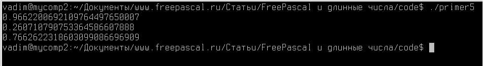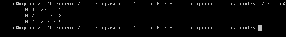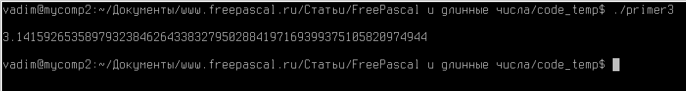 program primer3; Var Drob : mpq_t; num : mpz_t; den : mpz_t; Begin mpq_init(Drob); mpz_init(num); mpz_init(den); // Здесь 123 - числитель, а 321 - знаменатель дроби mpq_set_str(Drob, '123/321', 10); mpz_set_str(num, '123', 10); mpz_set_str(den, '321', 10); // А можно присвоить отдельно числитель mpq_set_num(Drob, num); // И отдельно знаменатель mpq_set_den(Drob, den); ... mpq_clear(Drob); mpz_clear(num); mpz_clear(den); End.
