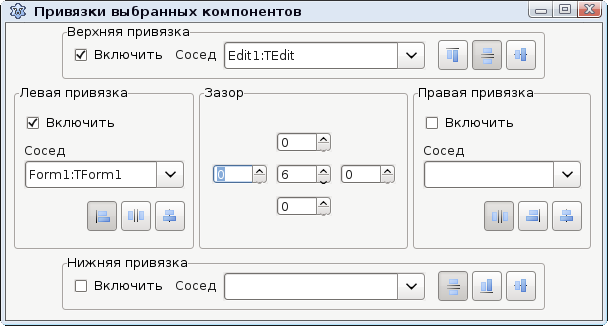 Если же в выпадающем списке выбран контрол-сосед — то поведение меняется. Теперь визуальный контрол будет всегда отслеживать положение указанного соседа и располагать свои границы в зависимости от того, где кончается (или начинается) соседний контрол. Также в игру тут вступают поля «Зазоры» - с помощью их мы можем определить зазоры между котролом и его соседом, к которому осуществлена привязка. Тип привязки определяется 3-мя кнопками, которые расположены правее выпадающего списка выбора соседа.