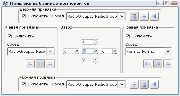 Привяжем метки и строки ввода в той последовательности, в которой они указаны на рисунке. Для этого у всех элементов (3 метки, 3 строки ввода и 1 RadioGroup1 — для CheckGroup1 будут отдельные действия) выставим общий зазор 6 точек. Это делается через центральный SpinEdit у редактора привязок. Он просто упрощает операцию указания зазоров со всех сторон (вокруг). Можно то же самое сделать и просто указав зазор в 6 точек во всех 4-х полях.