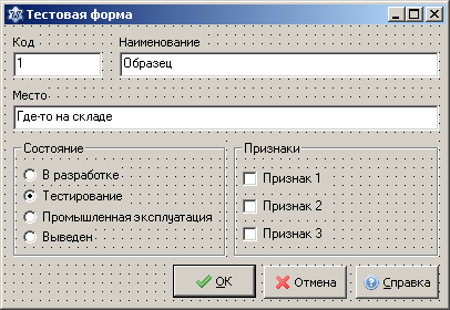 На разрабатываемой форме рядом находятся 2 сложных элемента: объект CheckGroup1 типа TcheckGroup и RadioGroup1 типа TradioGroup. Сложность заключается в том, что в RadioGroup1 находится 4 элемента, а в CheckGroup1 — 3 элемента. При установке у обоих объектов свойства AutoSize = true — размер CheckGroup1 будет меньше, чем размер RadioGroup1. Вот для исправления этой ситуации мы не будем устанавливать авторазмер у CheckGroup1, а осуществим привязку размеров жёстко к набору RadioGroup1 — его размер по высоте всегда будет больше. Пример этой привязки приведён на рисунке. Правая граница CheckGroup1 будет привязана к правой границе окна с отступом в 6 точек. При изменении размеров окно — группа будет растягиваться.