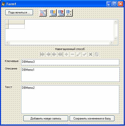 Навигационный способ подразумевает последовательную работу с записями(строками) таблицы, содержащейся в наборе данных. На навигационном способе доступа основана работа визуальных компонент из вкладки «Data Controls». Разместим на нашей форме компоненты TDBGrid, TDBNavigator и три компонента TDBMemo. И установим в их свойствах DataSource ссылку на DataSource1. В свойства DataField объектов DBMemo1, DBMemo2, DBMemo3 запишем description, text и keywords соответственно. (Напоминаю, что description, text и keywords – это название полей(колонок) в таблице myArtTable.) Поскольку наш набор данных первоначально находится в закрытом состоянии (Action=false), Lazarus будет выдавать предупреждение при попытке ввода названий полей. Не обращайте внимания - это нормально.