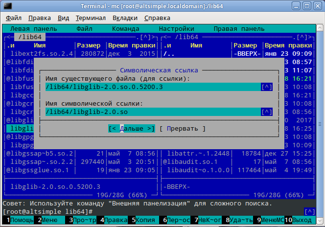 Это значит, что компилятор такие "хвосты" не любит. Обычно по этому поводу советуют ставить еще и "devel" версии библиотек. Если вы собираетесь писать GUI-программы на Си\Си++, то это в высшей степени полезный и единственно правильный совет. Однако я, к примеру, этого никогда не делал и добровольно делать не собираюсь. Как решить эту проблему, если не хочу ставить "devel"-пакеты? "Хвосты" библиотекам мы конечно же подрезать не будем (на всякий случай). Мне удалось узнать страшную тайну этих самых "devel"-пакетов − при своей установки, кроме добавления всяких нужных для сборки Си-программ файлов (типа "*.h", "*.a", "*.o" и т.п.), они ещё и делают безхвостый симлинк (символическую ссылку) рабочих библиотек. Так что мы тоже просто сделаем символическую ссылку с правильным названием (см. рис. 5) без всяких установок "devel"-пакетов: