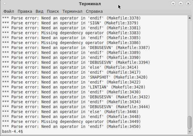 С рабочим окружением закончили, теперь можно приступать к сборке Lazarus'а. Здесь нас поджидает маленькая непонятка: команда "make" выдаёт, что буквально каждая строчка нашего Makefile это страшная и непоправимая ошибка (см. рис. 17).