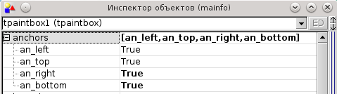 Нам необходимо учесть, что размеры основного окна (формы) могут быть изменены в процесс работы приложения. Чтобы привязать размеры и положение объектов на форме к размерам формы используются якоря (anchors). В окне Инспектора объектов (Object Inspector) для объекта tpaintbox1 разверните (нажав на «плюсик») список установленных якорей (anchors). Здесь четыре значения, которые можно установить в True или False. Если установить для an_left значение True, то при изменении размеров формы растояние между левой границей формы и левой границей объекта будет всегда оставаться неизменным. Соответственно an_top это якорь для верхней границы, an_right для правой и an_bottom для нижней. Установите все четыре значения (an_left, an_top, an_right, an_bottom) в True: