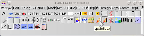 В окне Палитры компонентов (Component palette) на странице Widget найдите компонент tpaintbox и поместите его на форму. Растяните его на всю поверхность формы: