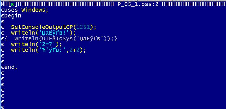 Подскажите, установлен FPC 2.6.4 при написании программы в операторе writeln используем русский текст. (writeln('Привет'))