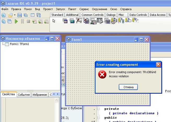 1. Обновил лазарус до сегодняшнего снапшота (Lazarus-0.9.29-27658-fpc-2.4.0-20101012-win32.exe). Качал отсюда http://mirrors.iwi.me/lazarus/ (Причина обновления - многочисленные советы на тему как избавится от очередного бага.)