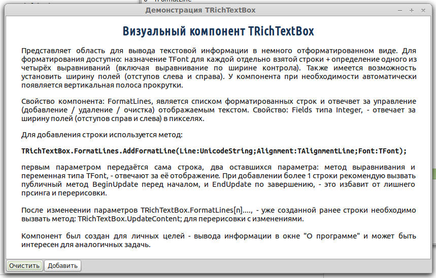 Небольшой визуальный компонент предназначенный для вывода немного отформатированной текстовой информации. Протестировал с использованием сборок компилятора версий 2.7.x для: WinXP 32, Linux Mint 64 GTK и QT. Запилил для личых нужд, отдаю как есть, может кому пригодится. Внимание для корректной работы компонента под Linux (как GTK так QT), необходим лазарус с исправлением бага: http://bugs.freepascal.org/view.php?id=25909